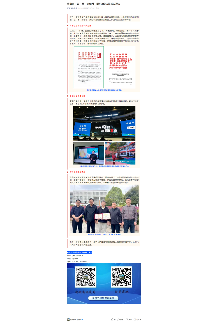【安徽省地震局微信公众号发布实录】黄山市:以“赛”为纽带 根植公众防震减灾理念